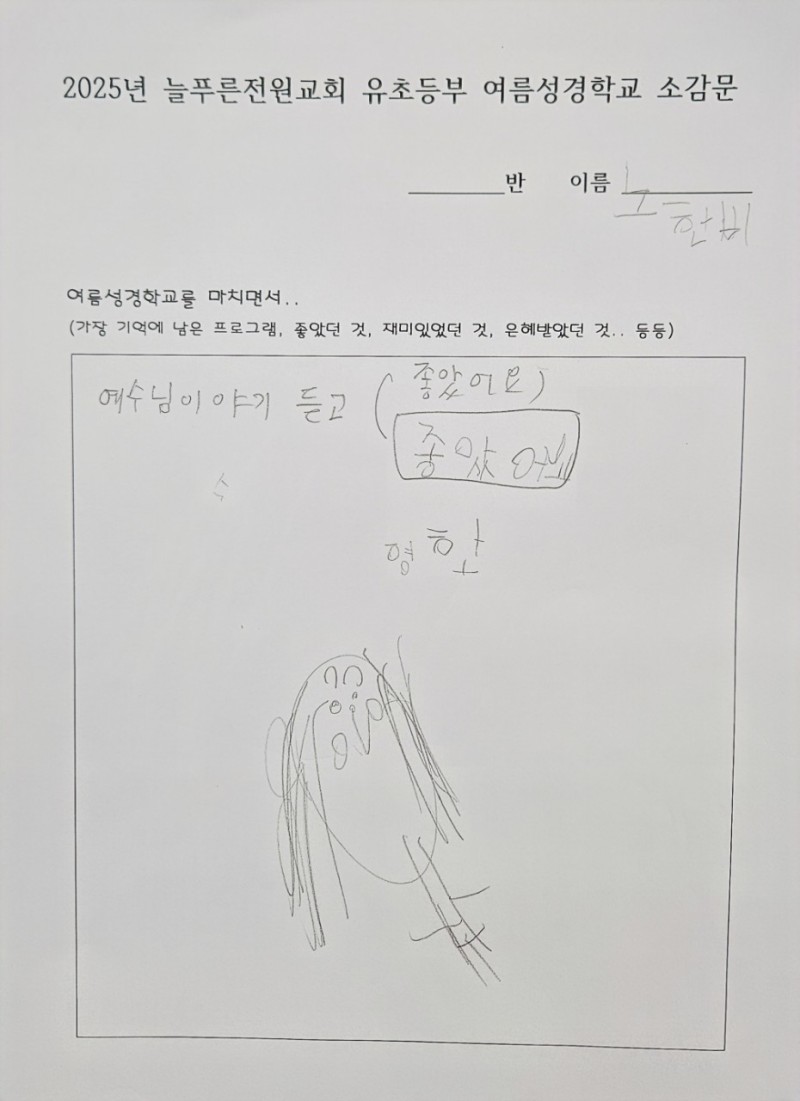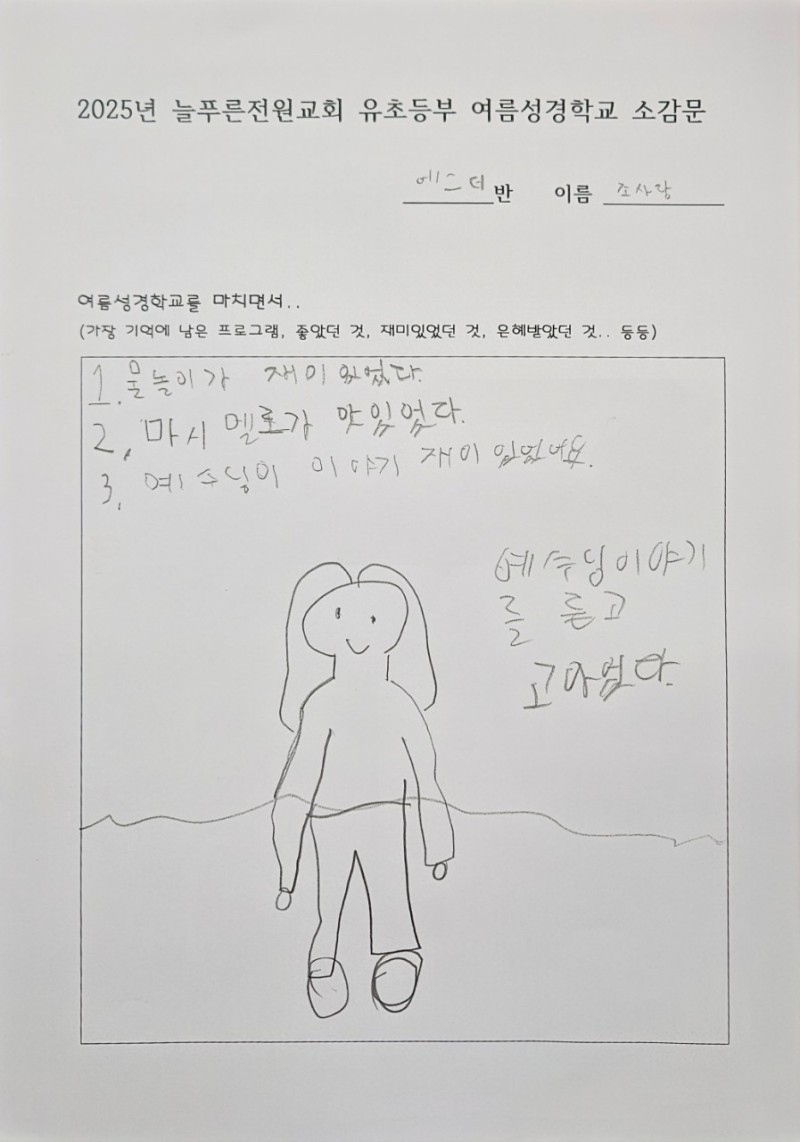 지난주에 성경학교 간증문을 짧게 적었습니다. 아이들이 가장 즐거워했던 것은 대형 물놀이였지만, 감사한 것은 예수님 이야기를 듣고 재미있었다, 예수님이 고마웠다는 말도 꽤 많았습니다. 아이들이 복음의 메시지를 듣고 조금씩 반응하기 시작했습니다. 이 모든 것은 성령님께서 아이들의 마음에 조용히 역사하신 은혜라 믿습니다. 앞으로도 그 믿음의 씨앗이 자라나도록 계속 기도해 주시기 바랍니다.