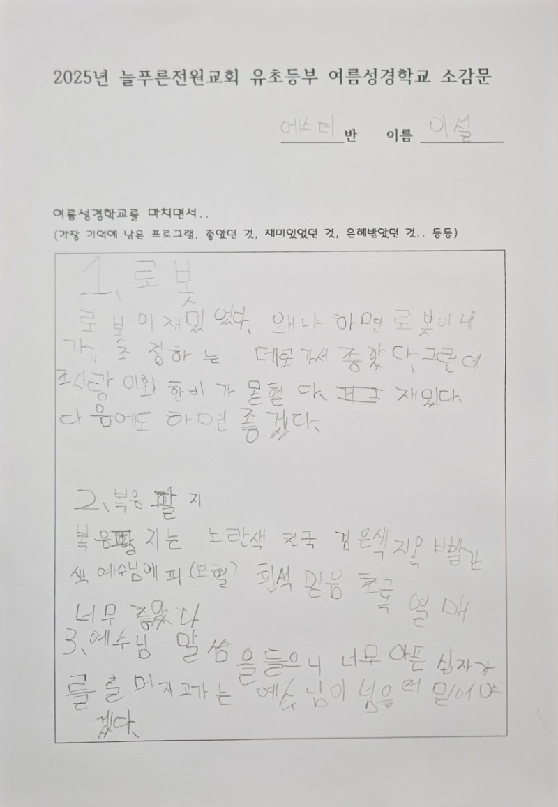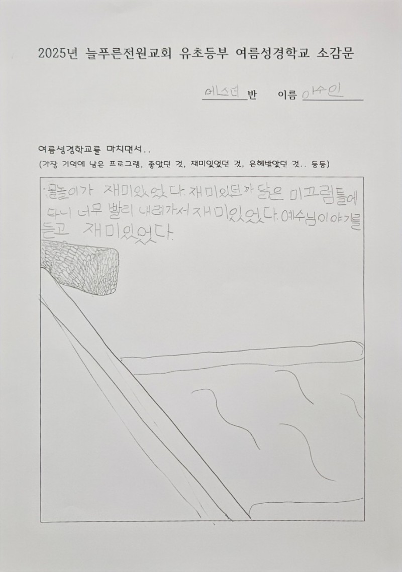 지난주에 성경학교 간증문을 짧게 적었습니다. 아이들이 가장 즐거워했던 것은 대형 물놀이였지만, 감사한 것은 예수님 이야기를 듣고 재미있었다, 예수님이 고마웠다는 말도 꽤 많았습니다. 아이들이 복음의 메시지를 듣고 조금씩 반응하기 시작했습니다. 이 모든 것은 성령님께서 아이들의 마음에 조용히 역사하신 은혜라 믿습니다. 앞으로도 그 믿음의 씨앗이 자라나도록 계속 기도해 주시기 바랍니다.